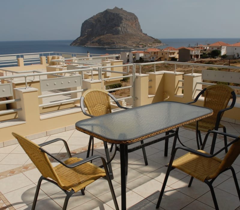 Each apartment of Klelia Hotel has a balcony overlooking the water and the rock of Monemvasia. When weather is sunny, guests can enjoy breakfast in the hotel garden.